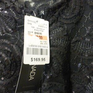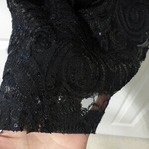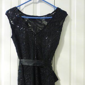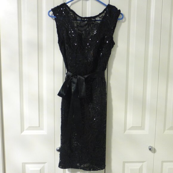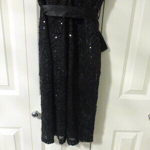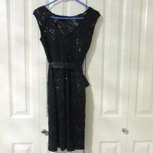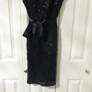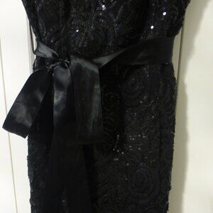 NWT! Super pretty shiny all over black sequins with satin tie. Dress is about knee length. Zips up in the back.