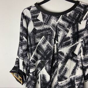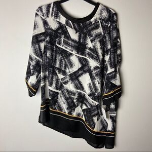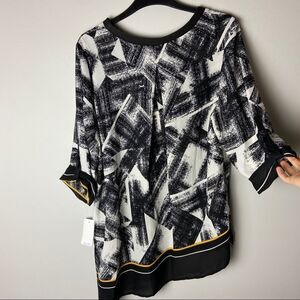 NWT black white yellow abstract light weight scarf top 3/4 sleeve blouse. Picadilly brand. Slightly sheer. Business casual.
