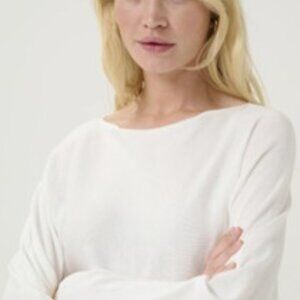 Lovely batwing sweater in spring gardenia with a flattering boat neckline and an elegant contemporary cut. Perfect casual summery style.