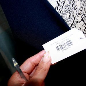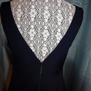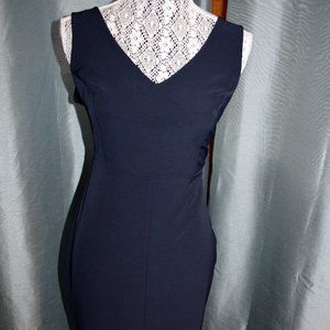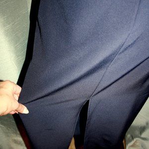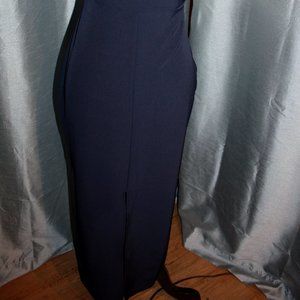 Front and back v neck with centre slit. Form fitting with stretch. back zipper, 38" bust, 30" waist, 40" hips, 51.5" long, 17.5" slit length. 94% polyester, 6% spandex.