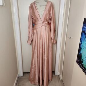 Pink 'Satin Twist' maxi dress/gown with long sleeves deep plunging-V and side slit, by Boohoo Occasions.