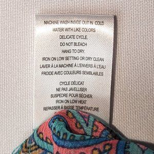Paisley: predominantly a greenish-turquoise with different shades of pink, as well as blue, white and orange