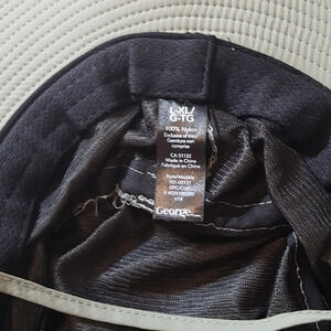 pretty soft khaki classic green color. 100% nylon, wide brim hat with adjustable sliding closure on neck strap