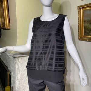 Brand new with tags lovely Banana Republic black overlay sleeveless blouse features round collar, single button back, and an elegant black over black pattern.
