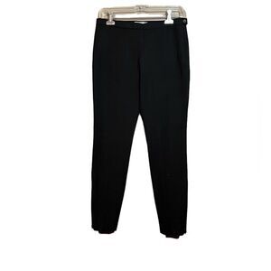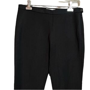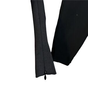 Buttons on the side and has 2 side zippers on the pant legs. Great basic pants.