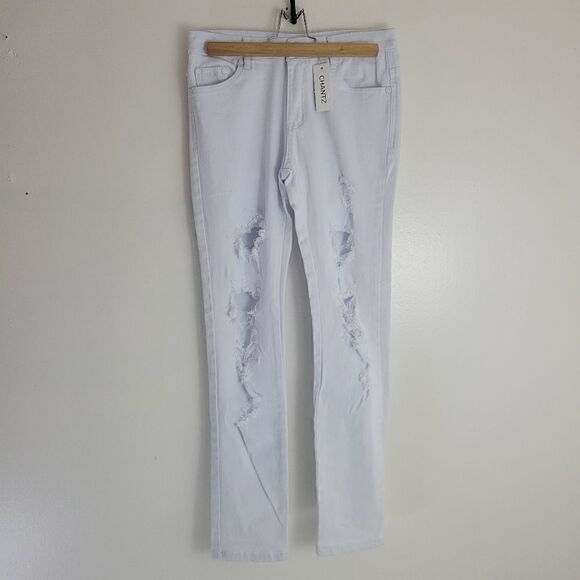 Brand new white distressed denim skinny jeans by Chantz. 98% cotton 2% poly. 5 pockets. Belt loops. Size S. Has stretch.