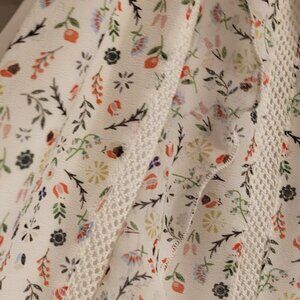 White with soft tiny flowers and lace details down the front and back. Black tie at the neck makes the neckline adjustable. Beautiful black bow falls over your shoulder.