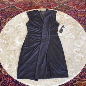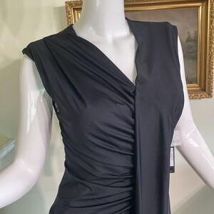 One of the loveliest designs in a little black dress! Flattering fit with elegant draping and rushing and a sheer back for extra sexiness. Clean neckline, sleeveless and mid thigh length. Lined from the waist down.