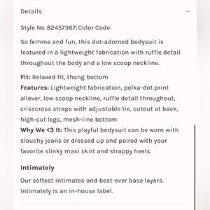 Soft green polka dot bodysuit with ruffle detail and cross-back tie. Lightweight viscose, stretchy mesh bottom. Main 100% viscose. Mesh 95% polyamide, 5% elastane. Great for pairing with denim or skirts.