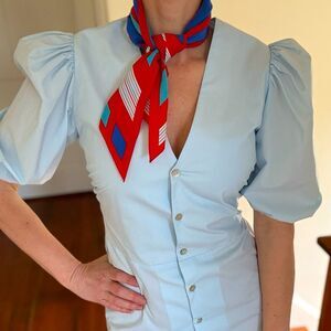 This a fabulously constructed cotton dress. It feels and looks great on. Those puff sleeves are so good. It's so chic and gorgeous, a day to night dress that can be accessorized to dress up or down. Button down. If you're familiar to Horses, it's a similar style to the Paz dress.