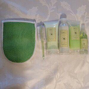 Brand new set of products with tags, in a plastic cosmetic bag with zipper.