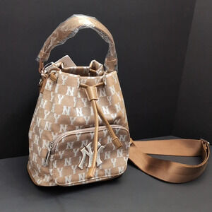 NWT,MLB New York Yankees Baseball tan Jacquard Monogramed small drawstring bucket crossbody bag.