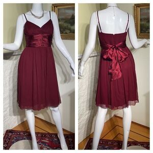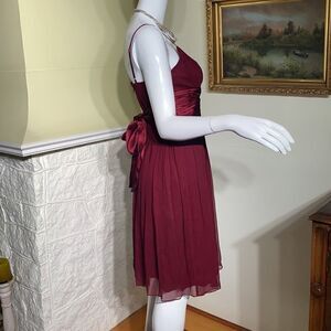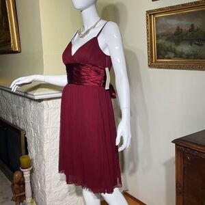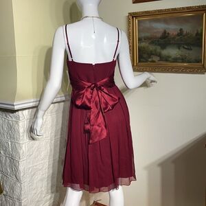 Brand new gorgeous burgundy silk party dress from Maggy London. Thin adjustable straps, cross over bust line, high waist with satin band and sash that ties at back. Light flirty skirt, back zipper, fully lined.