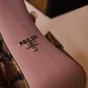Absolutely stunning Prada metallic jacquard platform heeled sandals. Gold/black patterned fabric.