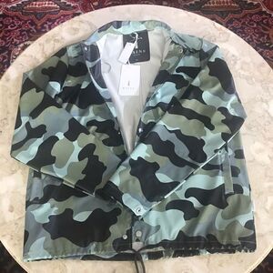 Brand new with tags RAINS jacket, camo print, snaps along front, two wide pockets, drawstring to cinch bottom. Waterproof, breathable and light weight. Unisex style