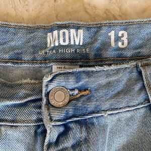 Brand new SWS Denim ultra high rise mom jeans, with distressed front and frayed hems. 5 pocket styling, belt loops, zipper and button closure, light wash denim.