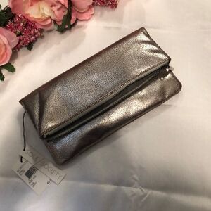 Women's metallic crackled clutch handbag with leather and chain removable straps and inside zip pocket.