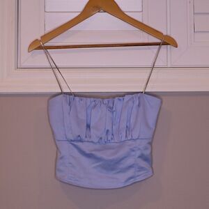 Baby blue satin Denitza crop top from Revolve brand, Superdown. Featuring side zip closure and silver strap accents. Corset top style.