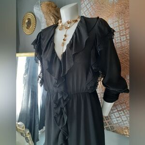 gorgeous and brand new chiffon and lace ruffled voluminous mini dress from Zara. New with tags, skirt has a sewn in slip, top is semi sheer. Ballon sleeves with buttons at cuffs. elastic waist, pullover style. deep v neck with ruffles down front. lace at shoulders. size xs. see flat lay measurements below. see pics for material composition.