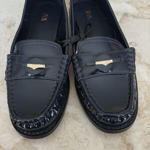 Brand new with tags classic retro style Penny loafers from Zara. These preppy little loafers are in a dark blue faux patent leather.