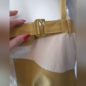 chic and extremely on trend patchwork structured garbardine mini dress from Zara. brand new, never worn. this one went viral and is a blogger fave! spaghetti straps with side zip decorative detail. side zip closure with belt fascinater around bust. fully lined. boxy a line silhouette. looks amazing worn alone or layered over a t or blouse! assymetrical hemline. size medium, fits true to size. see flat lay measurements below!