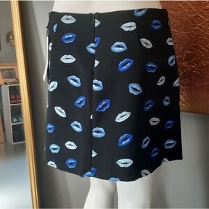 adorable and very mod inspired lips print mini skirt from Zara. brand new, perfect condition. a line silhouette with back zip detail. chic blue and black novelty lips motive. 100% viscose. thicker structured fabric. size medium, fits true to size. see flat lay measurements below!