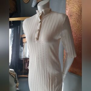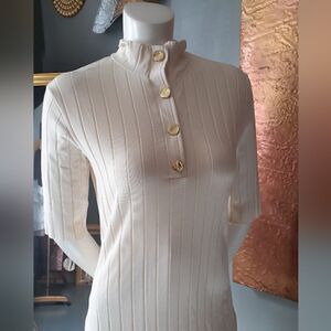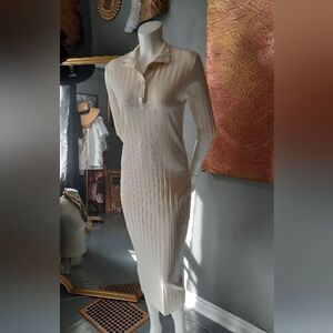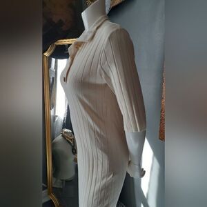 sleek and minimalistic ribbed stretch cotton midi dress from Zara. goldtone buttons with 3/4 sleeves. super stretchy and comfortable. very small blue discolouration on inside of collar ( was sold like this). not noticeable when worn and can most likely be washed off. will be reflected in the price. cream in colour. size large but runs small so it's being listed as a size medium! see flat lay measurements below!