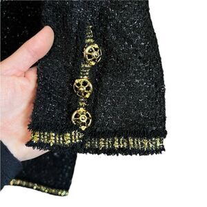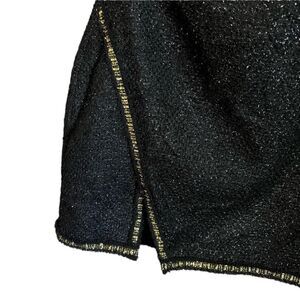 The side zip ensures easy wear, and the tweed-like material with gold trims adds a festive flair, making it a perfect choice for holiday gatherings. With a flattering armpit measurement of 17 inches and a length of 32 inches in a flat lay, this dress ensures a comfortable and stylish fit.