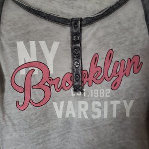 Brooklyn NY Varsity T-shirt, mid length sleeve, cotton/poly blend, size medium partial buttons on front. Measurements are 15 1/2" armpit to armpit and 24" shoulder to bottom hem.