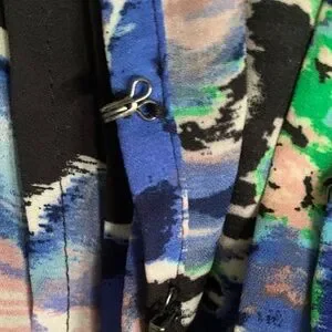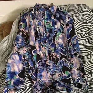 Vibrant blouse with abstract design. Features blue, pink, and black hues.