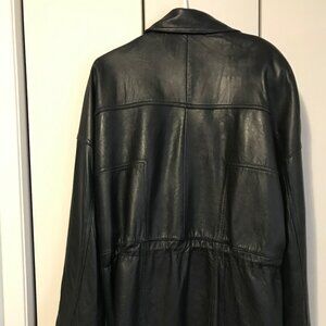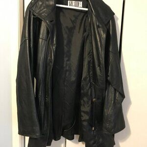 Jacket is large size, with a nylon lining. The jacket has a drawstring tie on the inside for a fitted style. There are two deep pockets on the front of the item.