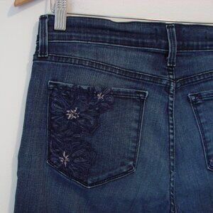 - high quality jeans by Not Your Daughters Jeans NYDJ, made in the USA, feature a zippered and button front, 5-pocket design, embroidery on back pockets, raw hem,