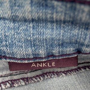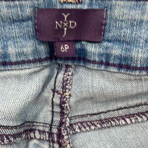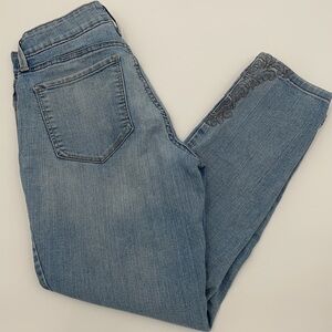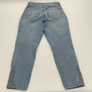 NYDJ Not your daughters mom jeans. Light faded blue with embroidery at the bottom near the cuffs on each leg, lift and tuck technology, ankle cut, very comfortable. Zipper and button closure.Ladies size 6 petite.
