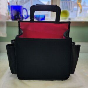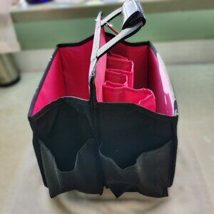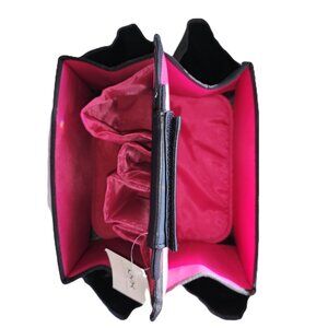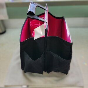 NYX open top cosmetic tote bag in Black and bright Pink. 25 cm or 9.5 inches wide by 25 cm or 9.5 inches deep by 28 cm or 10 inches tall w/o handles included. Roomy tote with open top allows for easily dropping in and extracting of cosmetics, hair products and much more! Great condition, not used.