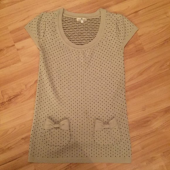 Comfort and warmth of a sweater, chic look of a mini dress! Cute little hearts inlayed in knit, and bows on the pockets.