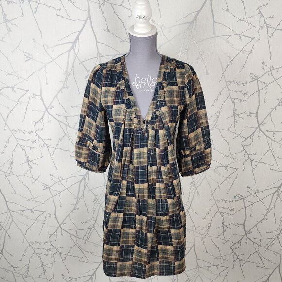 Naf Naf Beige Plaid Cotton Pleated Front V-Neck Tunic Dress