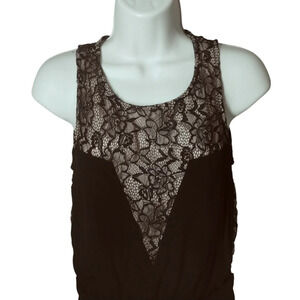 Cute jumpsuit/ playsuit. Black lace nude lined sections in the front and in the back. Sleeveless. Long legs. Zippered back. Side pockets. Tie for the back or the front. Flowy fabric.