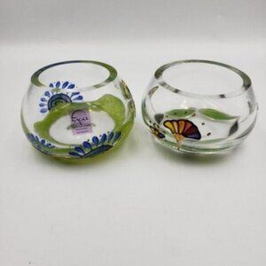 Nagel Glass Votive Candle Holders Hand Painted Colorful Heavy Glass Floral Two