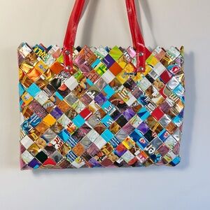 This distinctive bag is a conversation started!! Made from recycled Mexican foil candy wrappers, these bags are known for their unique style. Very durable.