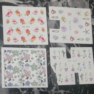 24 new pkg/sheets of nail stickers & decals plus with 3 other sheets that are slightly used so 27 in total (glow in dark winter themed, Valentine's day themed, Halloween themed, & many more). 4 bottles of OPI nail lacquer (3 hardly used & 1 is 3/4 used). New pkg of 70 very pretty black nail tips. New 10pk of reuseable silicone soak off nail caps.