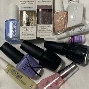 Lots of different types of nail polish, tools like nail files, nail glue, nail strengthener, nail polish quick drier.