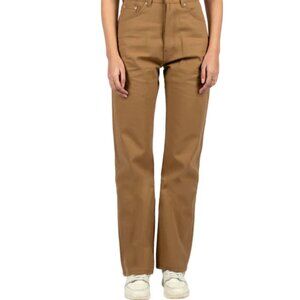 The Army Green Duck Selvedge is a 10oz Japanese selvedge canvas. The duck canvas is woven on vintage shuttle looms in a plain weave construction with a red line selvedge ID. The fabric has a tight weave creating a smooth durable surface resistant to snags and tears, which has made cotton duck has been popular in workwear from the late 1800s to today. Cut, sewn, built in Canada with tonal stitching, a dark brown full grain leather patch, and dark copper buttons and rivets. The Classic is a high-rise fit with a roomy straight leg that falls to a wide leg opening.