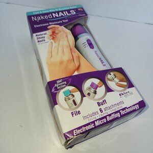 Are you tired of the cost and time of manicuring your nails? Or those harmful, damaging chemicals? It's time to go natural and beautiful with the all new Naked Nails! This battery-powered manicure tool gives your nails a natural, perfectly-polished salon look. Filing, buffing and shining your fingernails and toenails can be a time consuming task and it's hard to get salon quality results at home. Naked Nails files, buffs, and shines nails in seconds! Filing Attachment creates a salon-perfect shape. Buffing Attachment removes ridges and imperfections. High Shine Attachment reveals a healthy-looking, glossy shine. Operates with 2AA Batteries (not included).