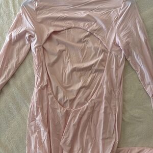 worn once for my baby shower and dry cleaned! Size medium but very stretchy! Open back!