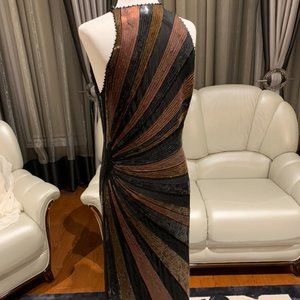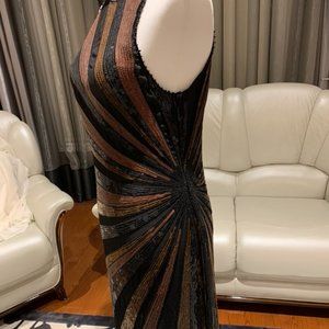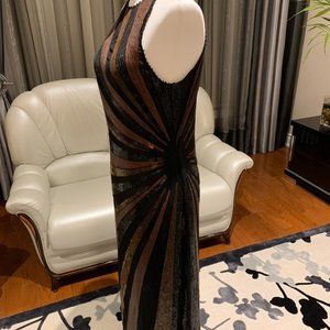 This is a stunning 100% SILK chiffon gown fully hand embroidered with sequins and glass beads. Dress was worn once to a wedding and stored. Was purchased at Holt Renfrew in Toronto.
