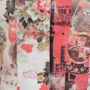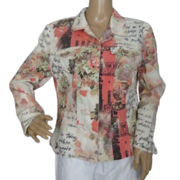 This captivating Nancy Bolen lightweight button-up jacket, designed with an artistic collage of mixed prints blends elegance with a creative edge. The fabric showcases an eclectic mix of floral patterns, abstract graphics, and handwritten script motifs, all layered in soft hues of blush pink, ivory, coral, and subtle accents of black for visual depth. It features a classic pointed collar and a front button closure with statement buttons that add a quirky, boutique charm. The long sleeves are gently tapered with simple cuffs, maintaining a relaxed yet structured silhouette. A single chest pocket seamlessly integrates into the artistic patchwork, enhancing the shirt’s unique, handcrafted aesthetic. The jacket's hemline falls just at the hip, making it a versatile piece to style tucked in or worn loosely over skirts and jeans. Its breathable fabric and thoughtful design details make it perfect for adding a touch of artistic flair to everyday outfits.