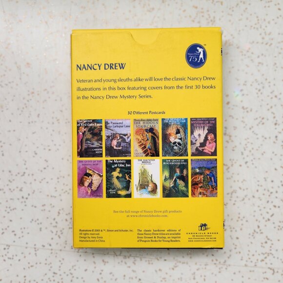 30 Postcard set of Nancy Drew book covers with traditional postcard mailing backings in a box. 2005. Chronicle Books. Like New excellent condition.