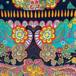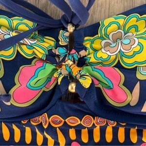 Nanette Lepore colourful floral print keyhole front halter tankini swim top. Lined, padded cups and ruched structural side boning. Could be worn strapless and tied in front or as a halter top, tied around the neck.