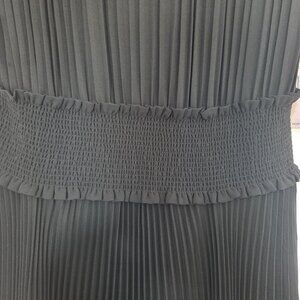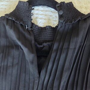 Gorgeous, flattering black maxi dress with pleated top and bottom. Very flowy. Elastic waist and beautiful ruffled collar with button in back. Size is 4 but could size up due to the amount of stretch. Perfect for evening, holiday party or vacation. Lined.