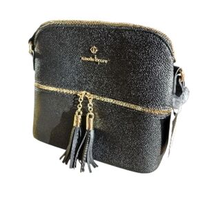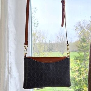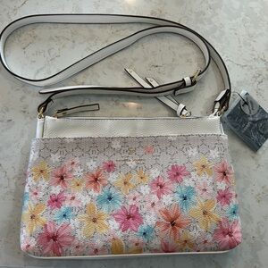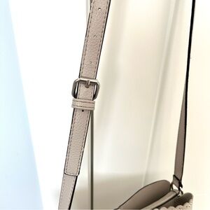 Nanette Lepore textured material crossbody in a calm and neutral grey wth beige undertones. Three compartments inside with a zippered middle and an inner zip pocket. Magnetic closures on either side. Pretty details with a scalloped lace design and metallic studded details. Overall good condition with some slight marks on the front as well as the fabric near the zipper and a spot in the corner as shown in the photos. All zippers are functional and in great working condition. I believe the material is faux leather but cannot confirm.